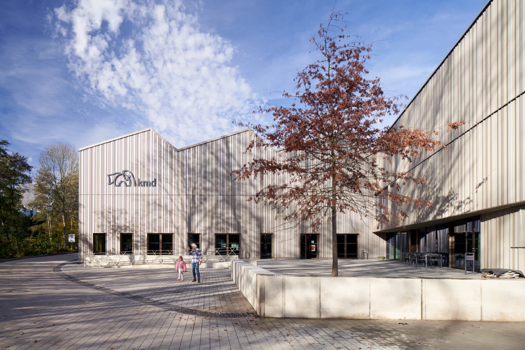 Das neu gefügte Ensemble öffnet sich mit einer Abfolge von Höfen zur Bachaue. Sie wird renaturiert und begleitet als naturnah gestaltetes Parkband die Wegeverbindung vom Ortskern zum Vorplatz des Kultur- und Freizeitzentrums. Der Eingangshof bildet den visuellen Endpunkt dieser Wegeverbindung, ein offener, fließender Übergang leitet in das Innere des Ensembles. Die auf den Vorplatz ausstrahlenden Funktionen des Zentrums beleben diesen. Im Sommer entsteht so ein lebendiger Treffpunkt, ein Haltepunkt, ein Haltepunkt an der Nord-Süd-Verbindung entlang der Bachaue.
